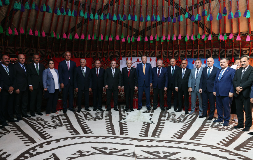 Cumhurbaşkanı Erdoğan’a, Türkiye Büyük Millet Meclisi Başkanı Mustafa Şentop, MHP Genel Başkanı Devlet Bahçeli, Aile ve Sosyal Hizmetler Bakanı Derya Yanık, Dışişleri Bakanı Mevlüt Çavuşoğlu, İçişleri Bakanı Süleyman Soylu, Adalet Bakanı Bekir Bozdağ, Hazine ve Maliye Bakanı Nureddin Nebati, Kültür ve Turizm Bakanı Mehmet Nuri Ersoy, Millî Savunma Bakanı Hulusi Akar, Millî Eğitim Bakanı Mahmut Özer, Sağlık Bakanı Fahrettin Koca, Sanayi ve Teknoloji Bakanı Mustafa Varank, Ulaştırma ve Altyapı Bakanı Adil Karaismailoğlu, Tarım ve Orman Bakanı Vahit Kirişci, Ticaret Bakanı Mehmet Muş ile BBP Genel Başkanı Mustafa Destici de eşlik etti.