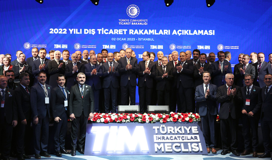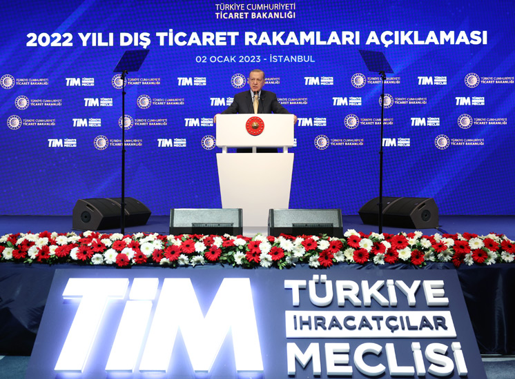 Cumhurbaşkanı Erdoğan, “2022 Yılı Dış Ticaret Rakamları Açıklaması” programında yaptığı konuşmada, “Tüm dünyayı derinden etkileyen Kovid-19 salgını, küresel tedarik zincirlerindeki aksamalar, Rusya-Ukrayna savaşı, ham madde ve enerji krizi gibi sıkıntılar ekonomimizin ve ihracatımızın hızını kesemedi. Tam tersine bu krizleri fırsata dönüştürerek tarihimizin en yüksek büyüme oranlarına ve ihracat rakamlarına eriştik” dedi.