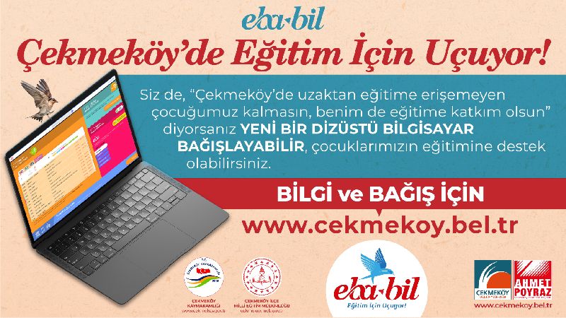 Çekmeköy Belediyesi’nin, Çekmeköy Kaymakamlığı iş birliği ile hayata geçirdiği EBA-BİL projesi ile yardım kuşu bu defa eğitim için Çekmeköy semalarında uçacak. Projeyle, bilgisayarı olmadığı için Milli Eğitim Bakanlığı’nın EBA uzaktan eğitim programına katılamayan öğrencilere, bilgisayar hediye edilecek. Kovid-19 salgını nedeniyle geçilen uzaktan eğitim sisteminde, Çekmeköy sınırları içinde tüm çocuklara eğitimde fırsat eşitliği sağlanacak.