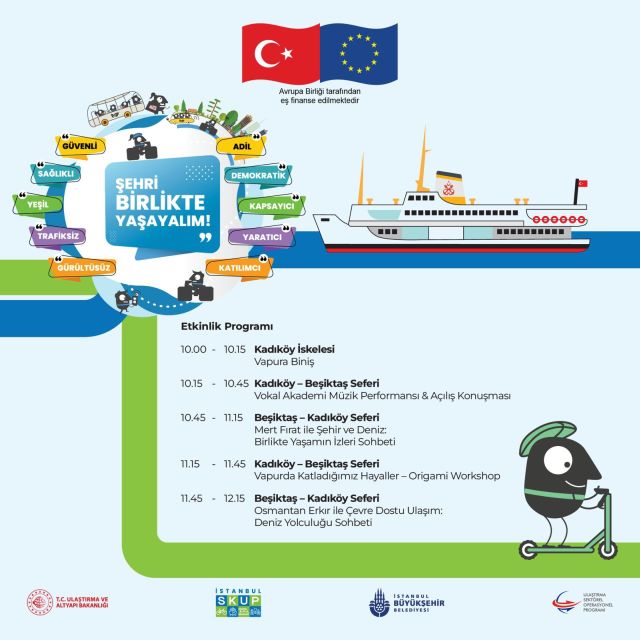 Etkinlikler, 10:15 Kadıköy-Beşiktaş seferinde Vokal Akademi müzik performansı ve İBB Ulaşım Planlama Şube Müdürü Melda Horoz ve Avrupa Birliği Türkiye Delegasyonu, Ulaştırma Sektörü Program Yöneticisi Akif Türkel’in açılış konuşmalarıyla başlayacak. Ardından 10:45 Beşiktaş – Kadıköy seferinde ünlü oyuncu Mert Fırat ile “Şehir ve Deniz: Birlikte Yaşamın İzleri” başlıklı söyleşi gerçekleştirilecek. 11:15 Kadıköy-Beşiktaş seferinde “Vapurda Katladığımız Hayaller” başlıklı origami etkinliği yapılacak. 11:45 Beşiktaş – Kadıköy seferinde ise İBB Ulaşım Grubu Başkanı Dr. Özgür Soy ile yapımcı ve sunucu Osmantan Erkır’ın “Çevre Dostu Ulaşım: Deniz Yolculuğu” başlıklı sohbetiyle etkinlikler tamamlanacak.