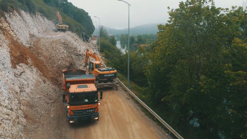 Bu amaçla yolun 12 metre yüksekliğindeki sert kaya yamacı, kademeli bir şekilde kırıldı. Buna ek olarak 95 metrelik toprak bölümde de şevlendirme yapıldı. Diğer çalışmalarla birlikte toplam 280 metre uzunluğundaki bir alan, hem araç hem de yaya ulaşımına uygun hale getirildi.