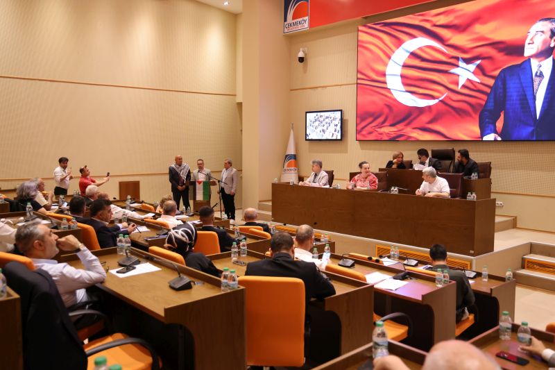 Çekmeköy Belediyesi Haziran ayı meclisi yapılan 2 oturumla tamamlandı. Haziran meclisinin 2. oturumuna CHP Grup Başkanvekili Gülali Alagöz’ün yaptığı eylem damga vurdu. Meclis konuşması sırasında Kurban Bayramı öncesinde akan kan dursun diyerek, meclis kürsüsüne Filistin Bayrağı asıp boynuna kefiye takarak meclisteki AK Parti ve MHP’ li meclis başkan vekillerini de kürsüye davet etti. Gülali Alagöz’ün bu eylemini tüm meclis üyeleri ve katılımcılar alkışlarla takdir etti.