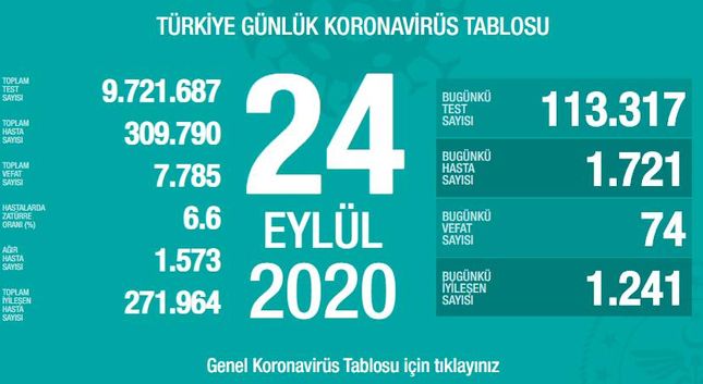 Sağlık Bakanlığı Corona virüsü için son gelişmeleri ve Türkiye Günlük Korona Tablosu’nu açıkladı. Türkiye’de son 24 saatte 113 bin 317 Kovid-19 testi yapıldı, 1721 kişiye hastalık tanısı konuldu. Son 24 saatte 74 kişi Kovid-19 nedeniyle hayatını kaybetti, ağır hasta sayısı 1573 oldu.